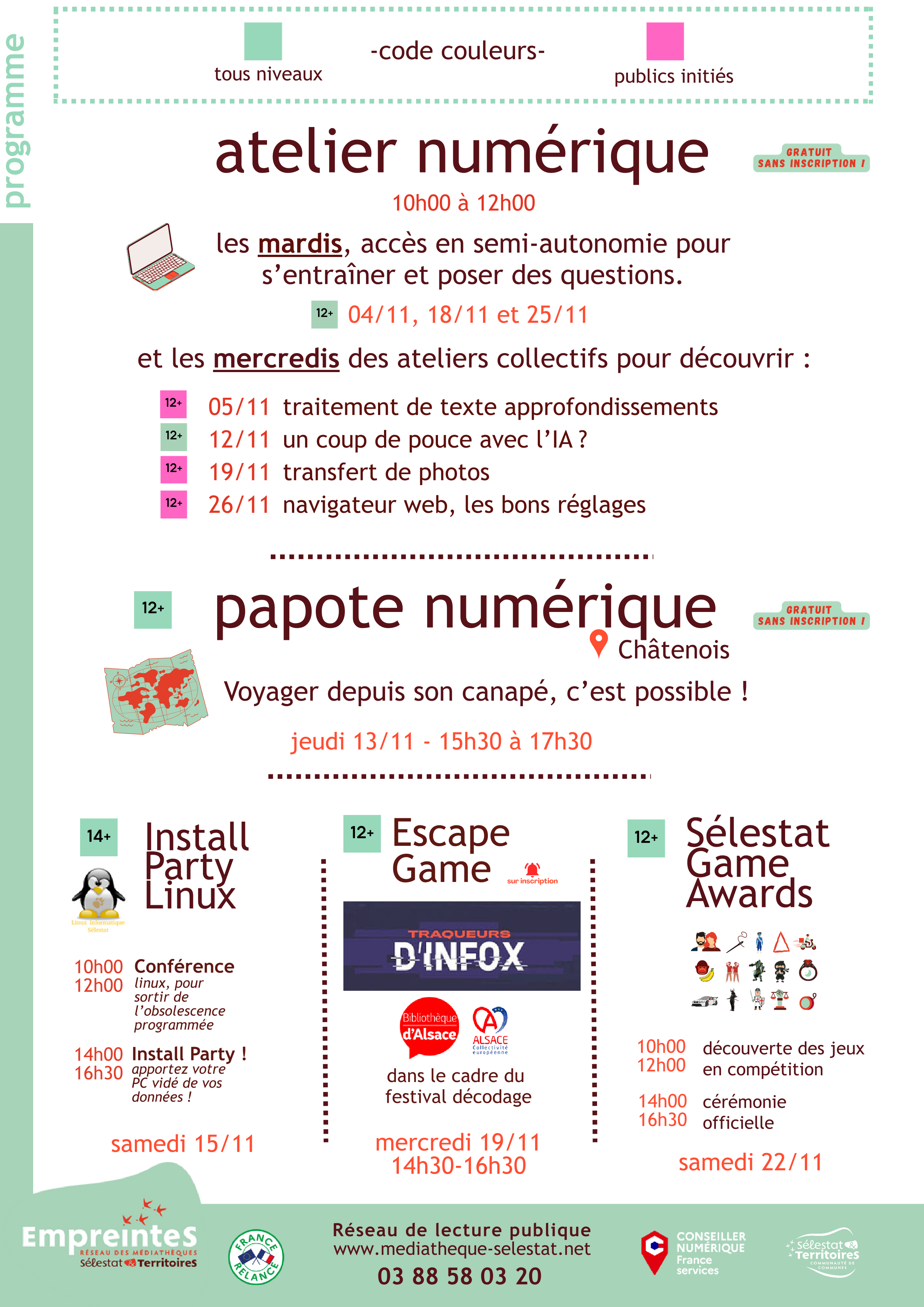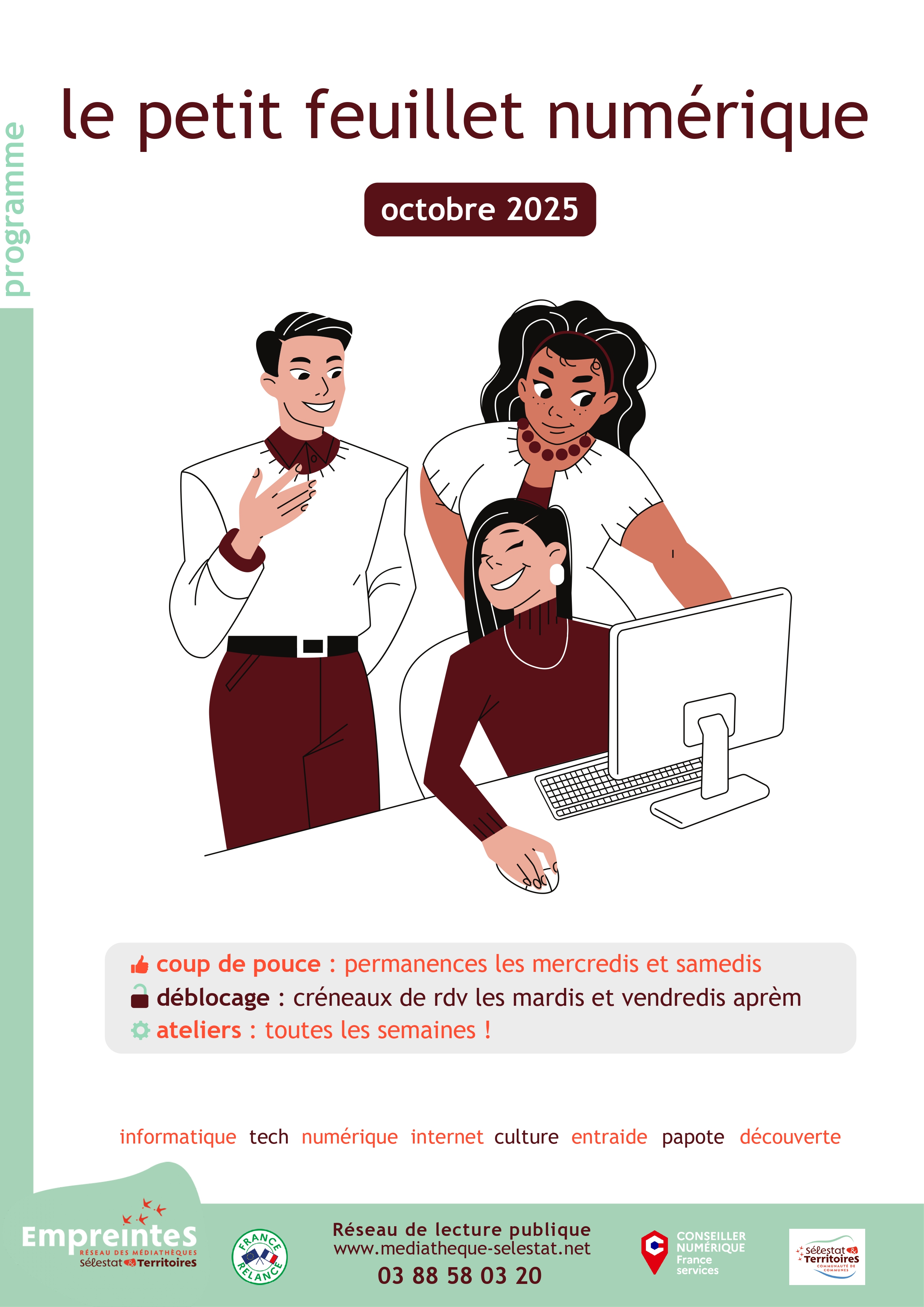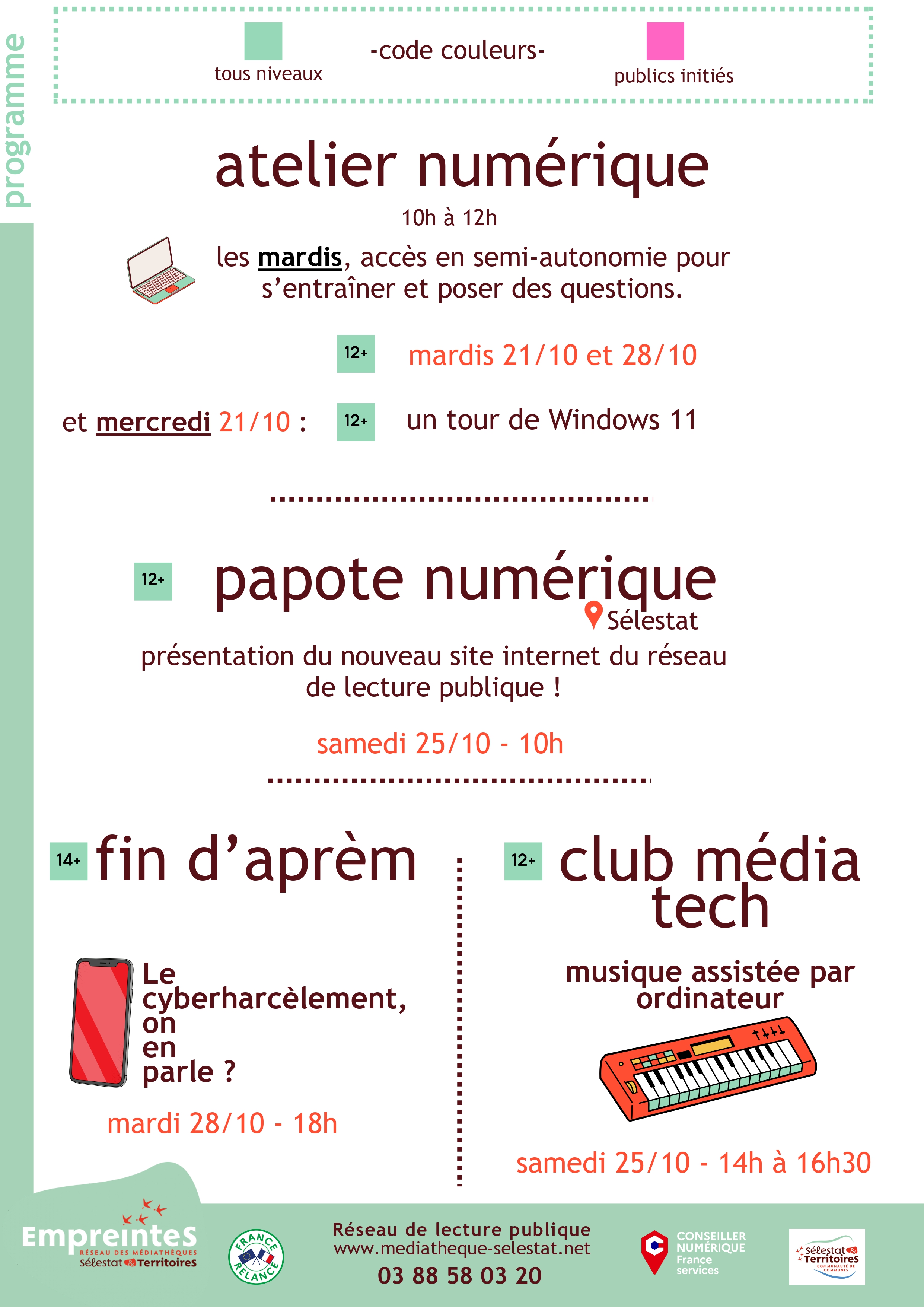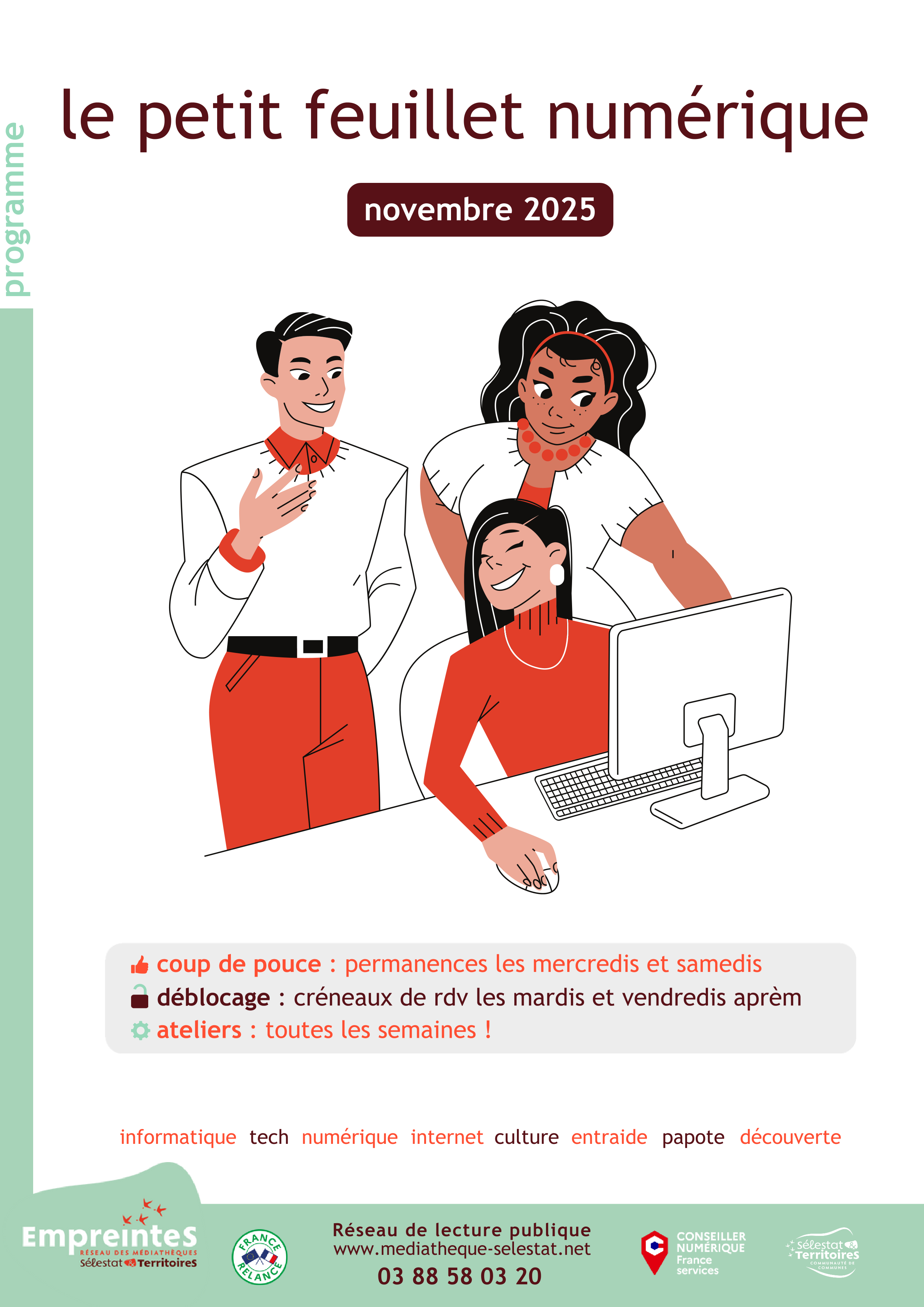 Besoin de vous entraîner et de monter en compétences ? des ateliers collectifs les mardis et mercredis matins, des “papotes numériques” pour discuter une fois par mois le samedi matin, des “fin d’aprèm” pour échanger autour de sujets d’actualité numérique et de société une fois par mois le mardi à 18h, et des animations thématiques ponctuelles en général les mercredis et samedis après-midi.